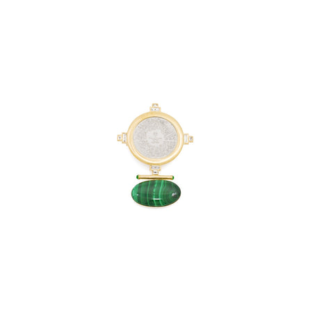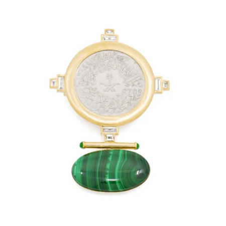 Celebrate Saudi history with our Coin Brooche. Inspired by the country's architecture, this brooche features a framed coin from King Saud's era and a Malachite stone, symbolizing growth and abundance.